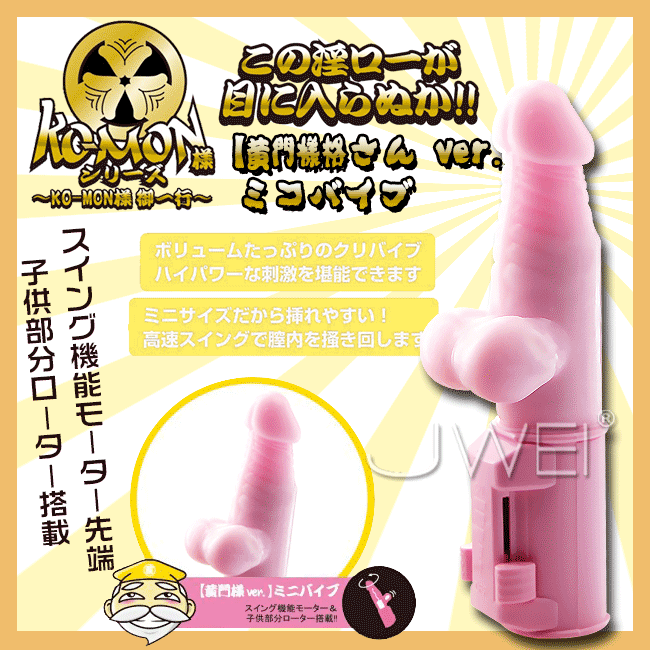 皆のもの控えおろう〜! この淫ローが目に入らぬか!! 高速スイングと強力クリバイブで的確に刺激の黄門様ver! 待望のKO-MON様シリーズ3種類が同時発売!! 世界最小サイズなのでバイブが初めての方でも安心。 サイズはミニでも高機能、ハイパワーモーターを搭載。 裏筋もしっかりついて、先端の高速スイングと強力クリバイブがポイントを的確に刺激します。 KO-MON様の熟練されたテクニックに、誰もがもうヤミツキ!