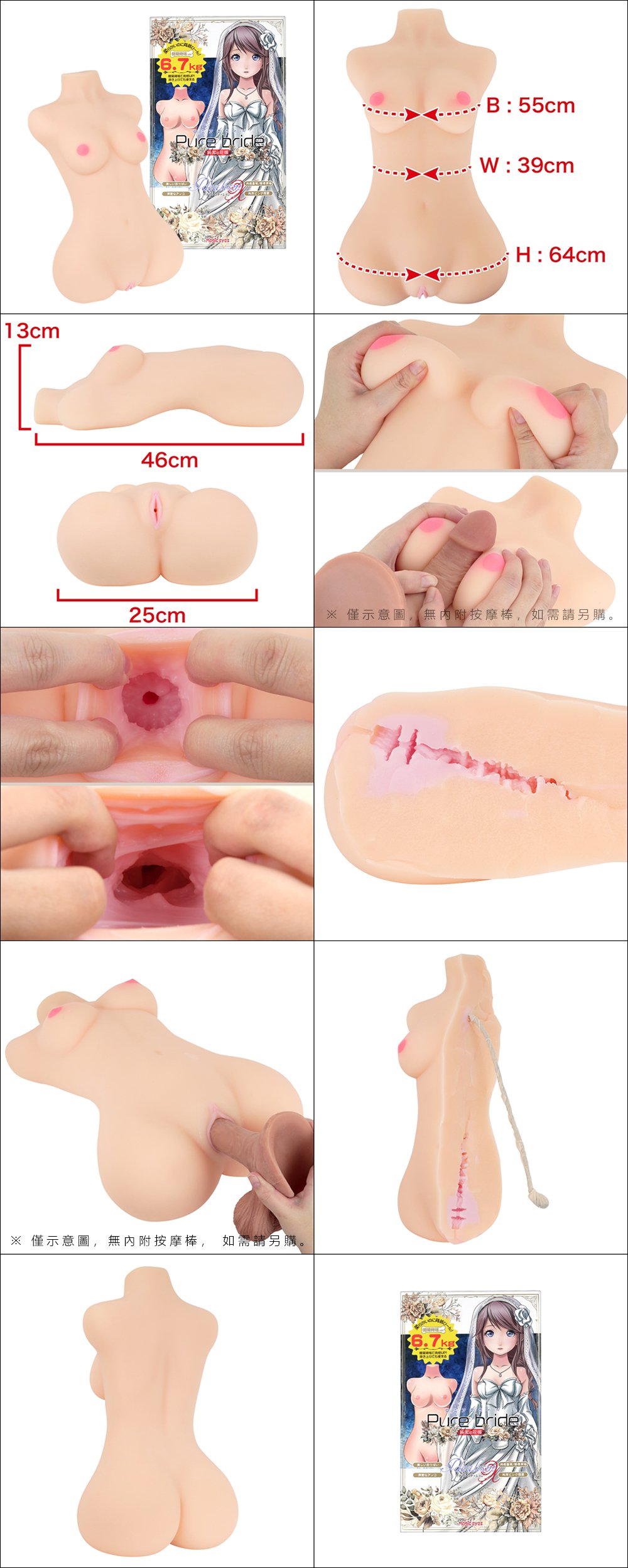 ピュアブライドイデアが肉感アップしてリニューアル!スリムで扱い易い全長46cm5.8kgからサイズはそのまま簡易骨格にすることで6.7kgへボリュームアップを実現!抱擁できる美乳の純潔ボディのイデアはピンク色のしぶとい純潔膜を突き破ると大きなヒダの膣圧で最深部15cmまでであなたを搾り取ります。10kg20kgの大きなドールよりも扱いやすいピュアブライドは様々な体位でのプレイにも対応!お風呂での使用も可能で浮かせれば重量を感じない無重力プレイも体験可能
