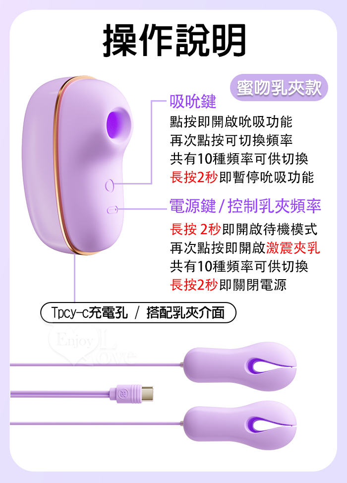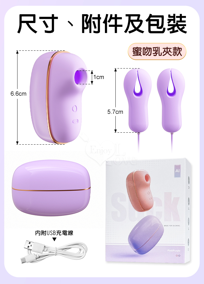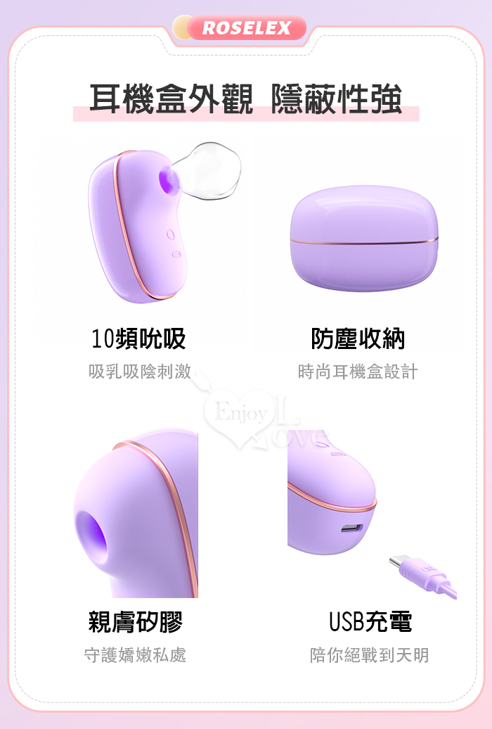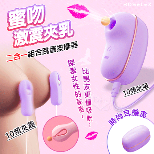 ►您現在的位置:首頁>ROSELEX 勞樂斯 ‧ 蜜吻乳夾款~吮吸+激震雙夾乳二合一組合按摩器﹝10頻調控+時尚耳機盒+USB充電﹞紫