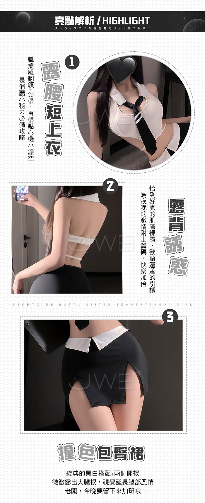 ►您現在的位置:首頁>OL領域.挖空露腰美背撞色雙開衩包臀裙OL小秘制服套裝【上衣+領帶+包臀裙+內褲】