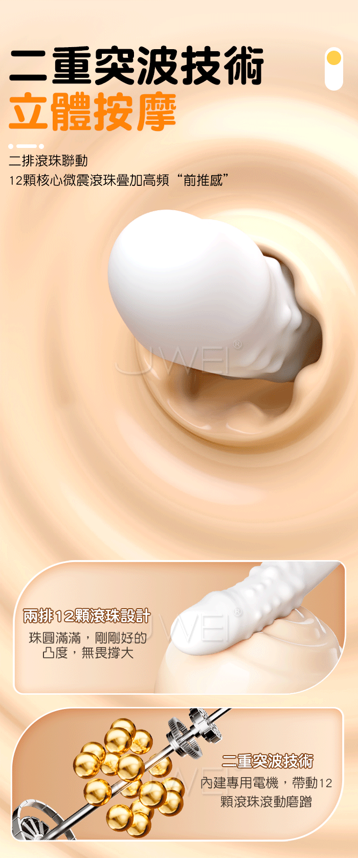 二重突波技術,立體按摩,二排滾珠聯動,12顆核心微震浪珠疊加高頻“前推感”