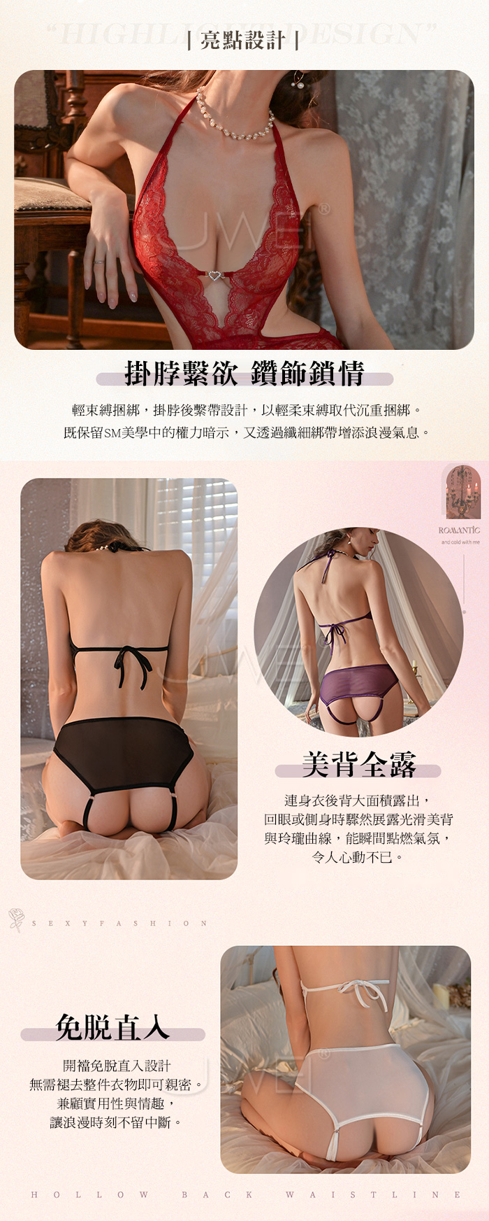 ►您現在的位置:首頁>繁花似錦.深V愛心鑽飾露胸掛脖繫帶美背蕾絲開襠連體衣【白色】