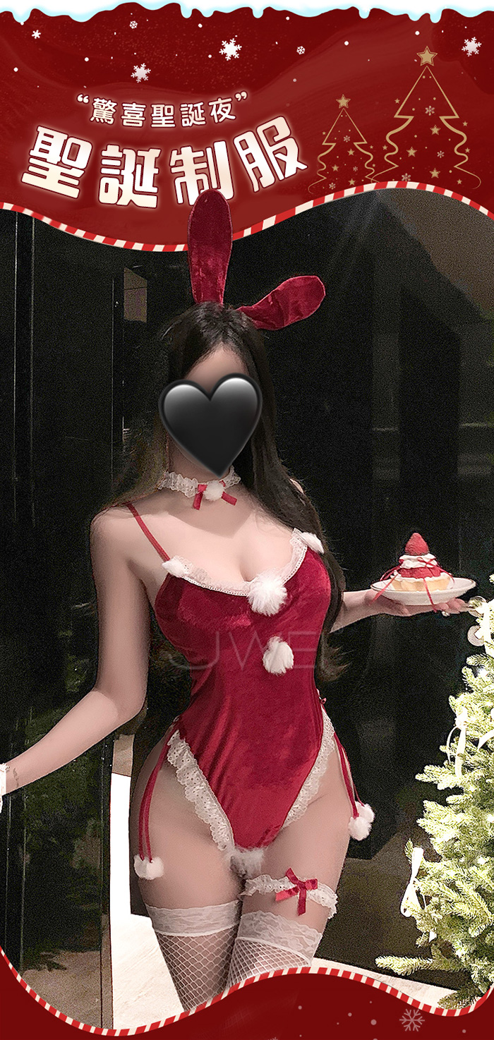 | 耶誕慾兔.蕾絲邊低胸毛球點綴絲絨性感兔女郎開襠連體衣【髮箍+頸環+連身衣+腿環-黑色】