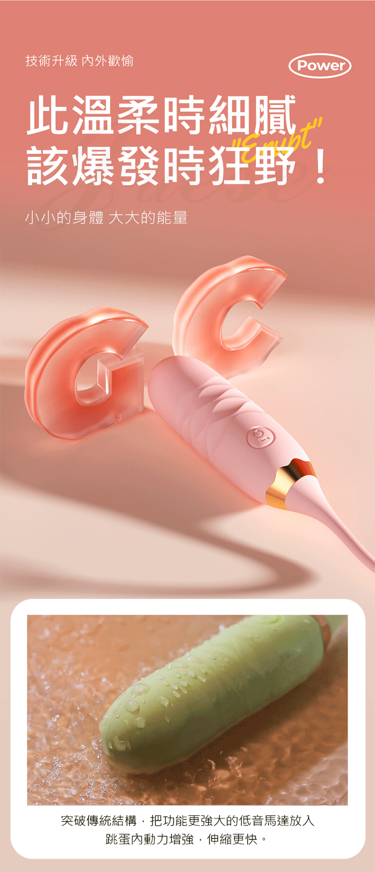 此溫柔時細膩該爆發時狂野!小小的身體,大大的能量,突破傳統結構,把功能更強大的低音馬達放入跳蛋內動力增強,伸縮更快。