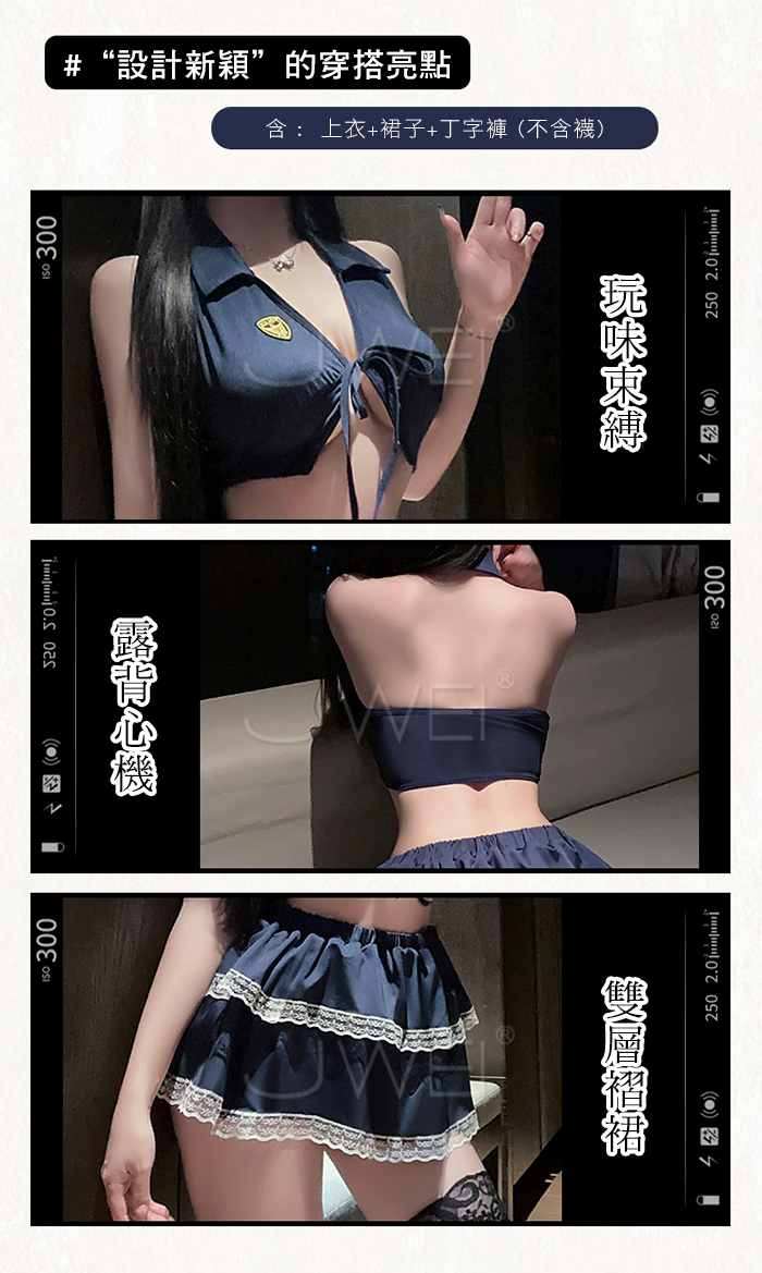 ►您現在的位置:首頁>夜縛魅警.玩味綁帶束胸露背雙層褶裙警花cos套裝【上衣+裙子+T褲】
