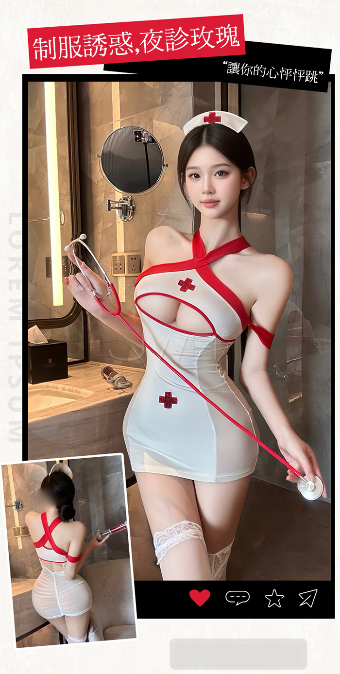 | 夜診玫瑰.純欲下胸挖空交叉肩帶美背包臀小護士cos套裝【洋裝+T褲】
