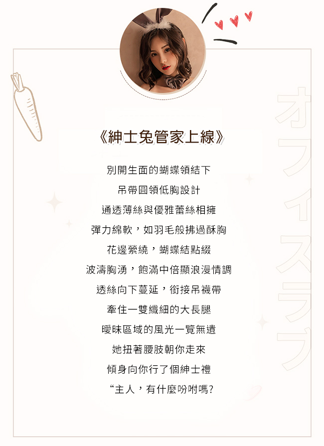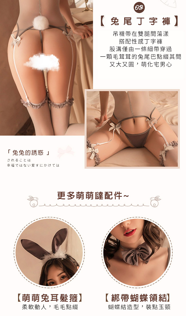兔女郎角色扮演服!低胸圓領木耳花邊薄絲吊襪帶性感露臀五件式套裝-含絲襪