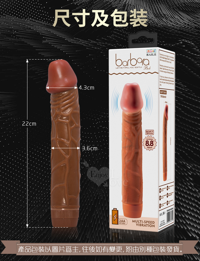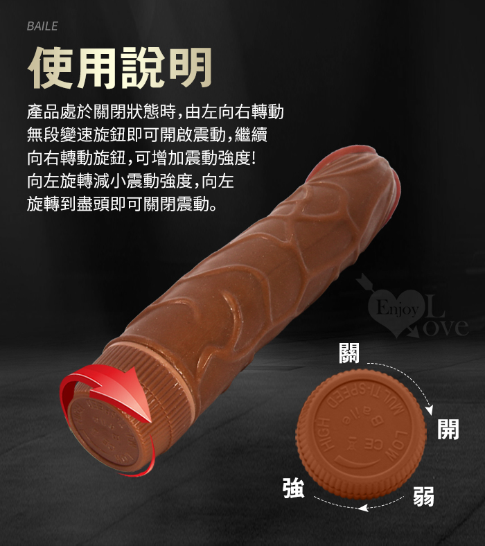 ►您現在的位置:首頁>【BAILE】Bob 鮑勃 8.8英吋無極微調震動 褐色肌仿真老二按摩棒