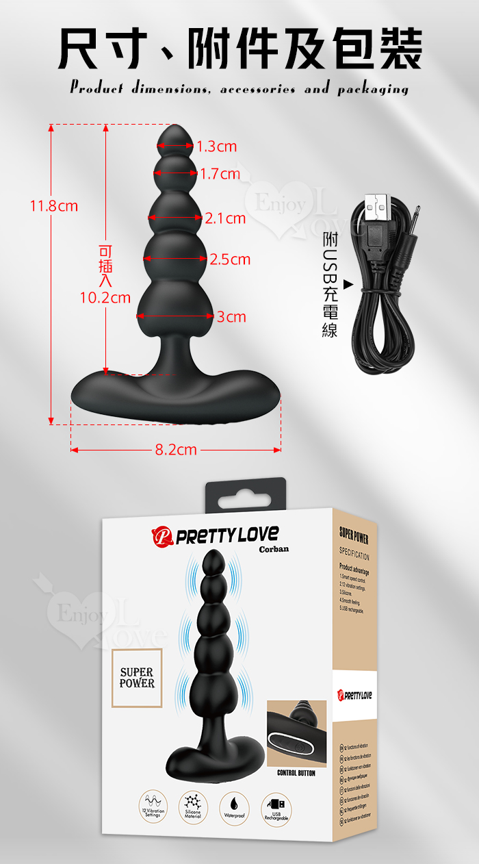 派蒂菈 ‧ CORBAN 科爾班 12頻強力震動~拉珠後庭按摩器﹝男女通用/柔軟矽膠/輕鬆入體/USB充電﹞