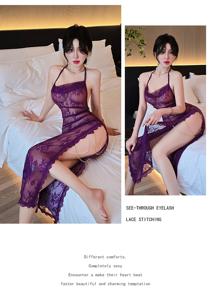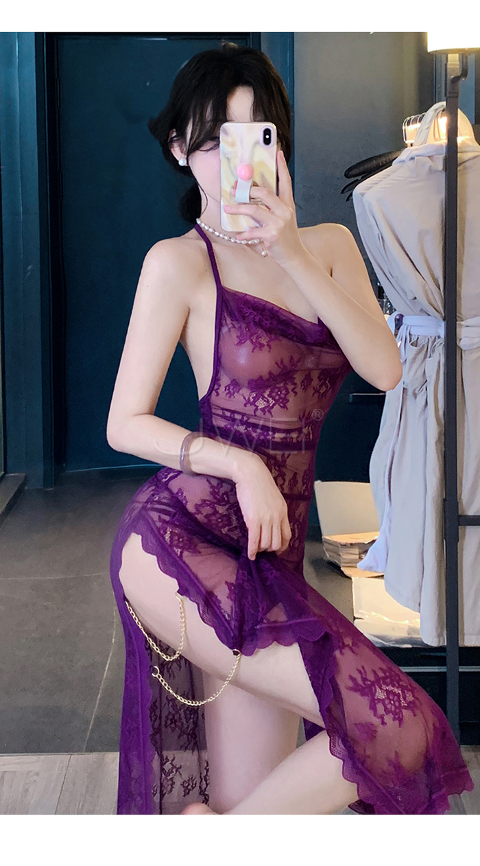 | 柔欲佳人.蕾絲蕩領美背半露兩側開衩透視睡裙-紫色【連衣裙+T褲】