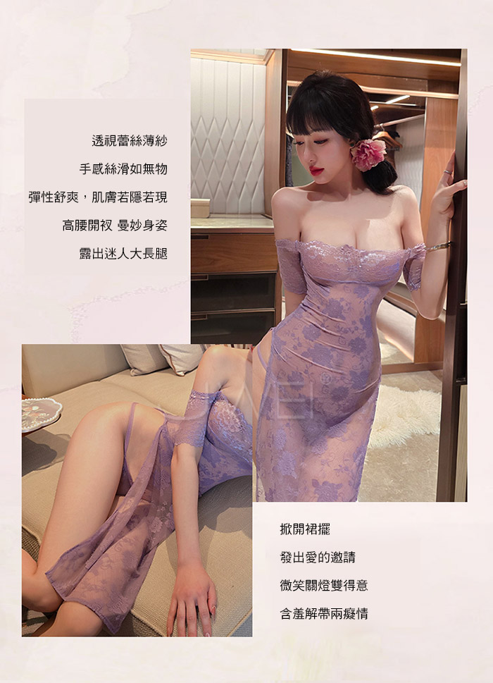 ►您現在的位置:首頁>漫野玫瑰.純欲一字肩蕾絲柔美鏤空開衩連身睡衣 【連衣裙+T褲】