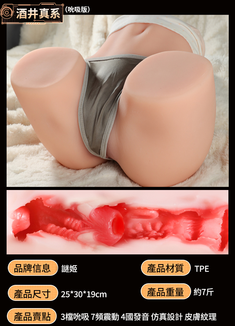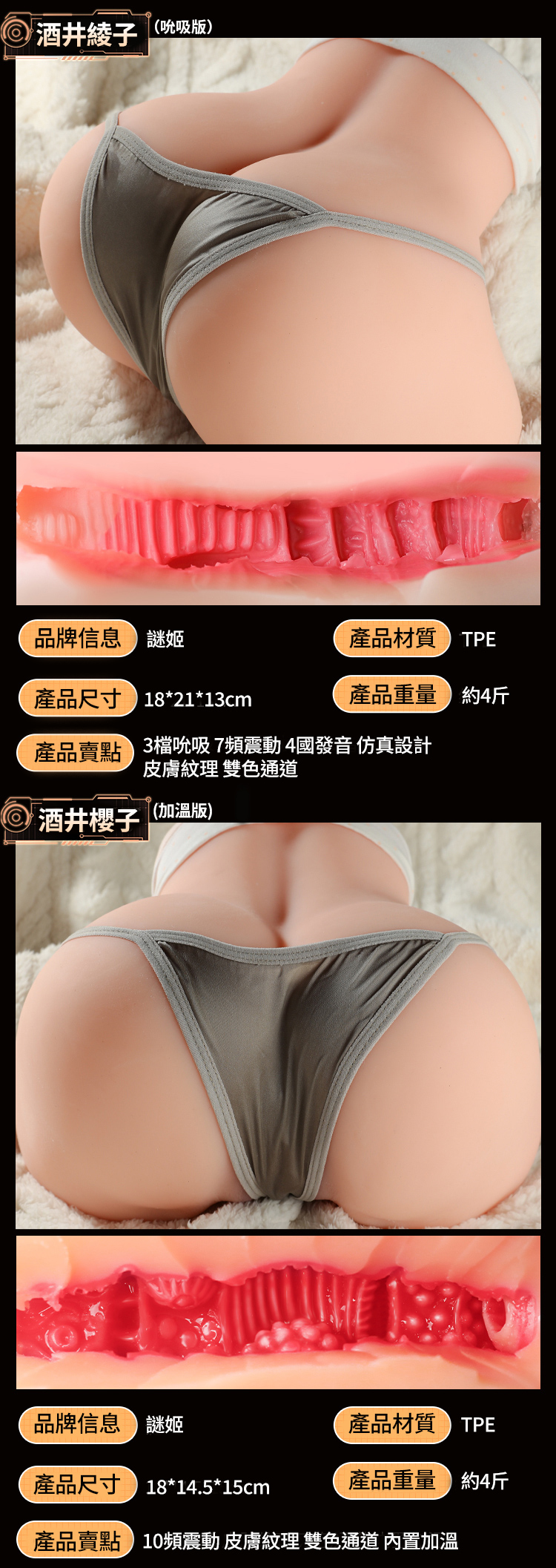 產品名稱:酒井櫻子 功能:加溫,震動 產品尺寸:15*18*14.5 產品裸重(KG):1.97 材質:TPE 單雙通道:雙 含包裝尺寸:16*18.5*15 附包裝重量(KG):2 包含功能:10頻震動,加溫 充電狀態:紅燈閃爍 充滿狀態:紅色長亮 工作狀態:長亮加溫狀態:閃爍是否支援快充:不支援防水等級:生活防水供電方式:磁吸充電口電壓:≤3.7V電池容量:1200mA充電時長:約1 H使用時長:約30分鐘