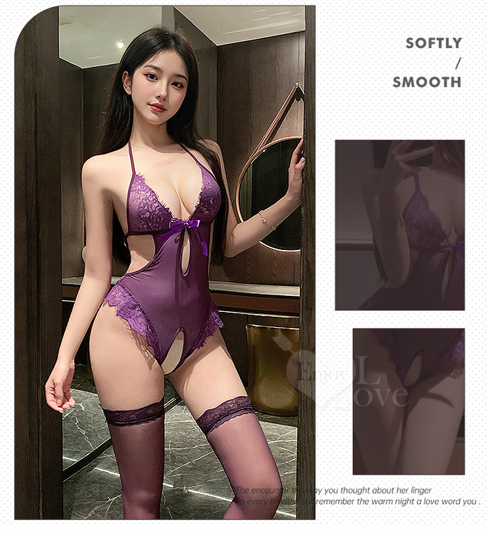 | 蕾絲綁脖透紗裸背連身衣|免脫開襠超誘惑﹝紫﹞