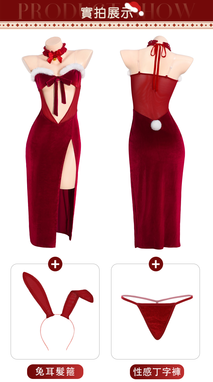 | 聖誕魅力/新年狂歡派對!兔耳毛絨蝴蝶結中空禮服|側開高衩性感長裙六件式套裝