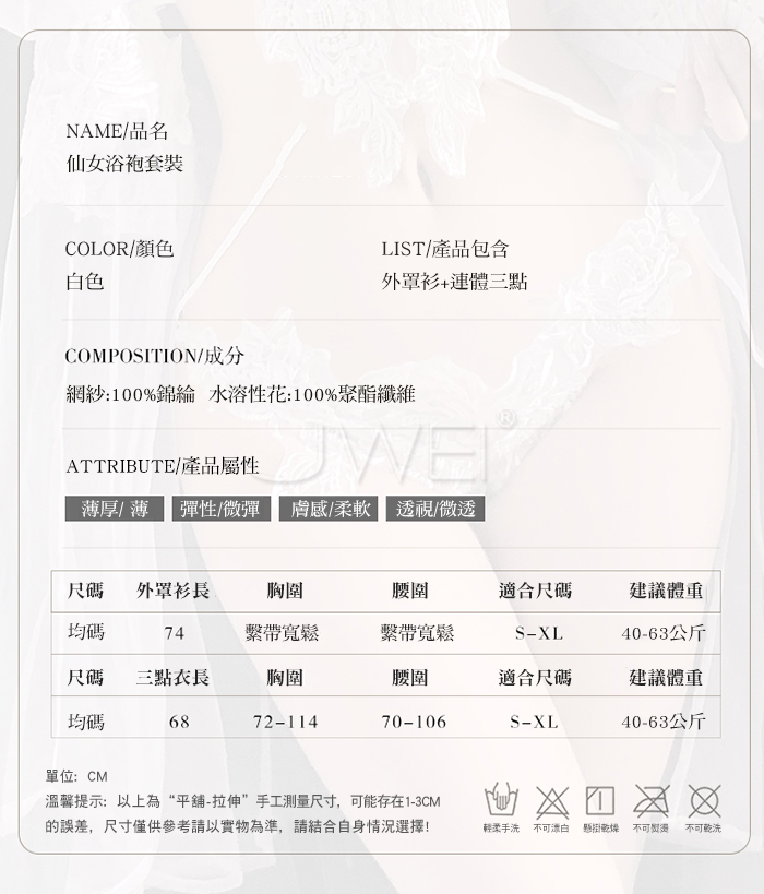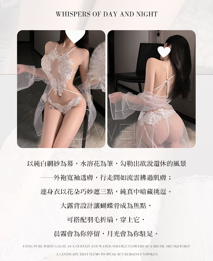 ►您現在的位置:首頁>白夜絮語.純白網紗透膚水溶花蕾絲三點式連體衣【外罩衫+連體三點】